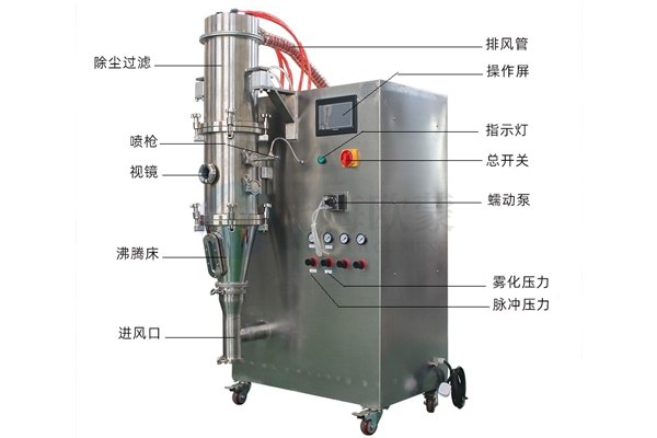 物料在潔凈的熱氣流(負壓)作用下懸浮形成流化狀態,其表面與熱空氣完全接觸,受熱均勻,達到了熱交換狀態,從而有著極高的效率。配上合適的噴霧系統,以及進一步的流化床功能結構改進后,更加貼切地表現出流化床噴霧干燥制粒、包衣的特性,即成為一種兼具干燥、造粒、包衣的多用途工藝設備。